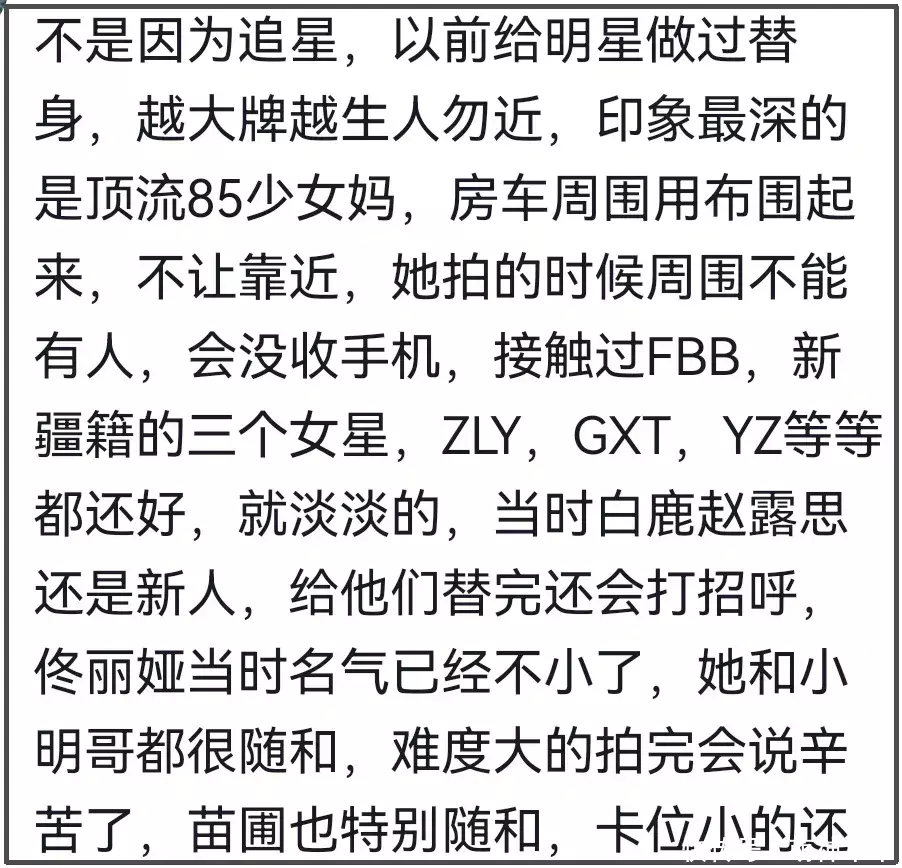当然也有几个明星没这么搞特殊,但态度也都淡淡的。佟丽娅、黄晓明、苗圃比较随和。网上有的时候还营销明星对替身好,而现实里,可能大部分替身都没见过明星本尊。