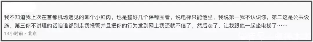 还有某爱豆,在机场不想和路人坐同一趟电梯,直接赶人,说“电梯只有他能坐”,好在后来路人也没惯毛病,直接回怼了。